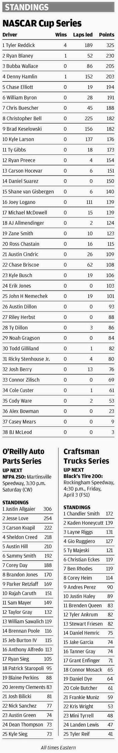 Reddick has finished outside the top 15 eight times at Martinsville. His worst finish was a 35th in 2022 when his head smacked the cockpit padding during a crash, and he pulled into the garage for evaluation at the care center.