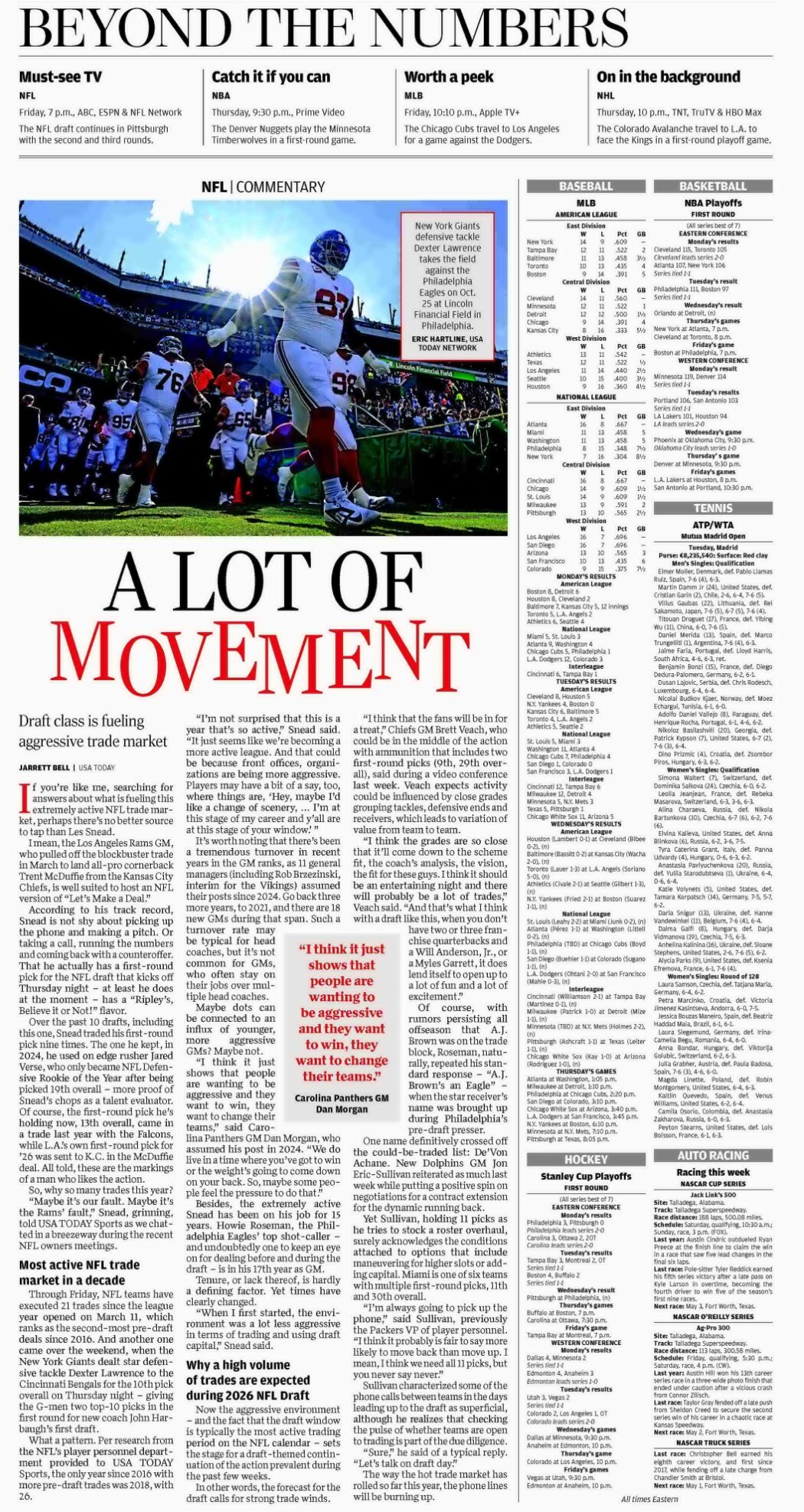 Through Friday, NFL teams have executed 21 trades since the league year opened on March 11, which ranks as the second-most pre-draft deals since 2016. And another one came over the weekend, when the New York Giants dealt star defensive tackle Dexter Lawrence to the Cincinnati Bengals for the 10th pick overall on Thursday night – giving the G-men two top-10 picks in the first round for new coach John Harbaugh's first draft.