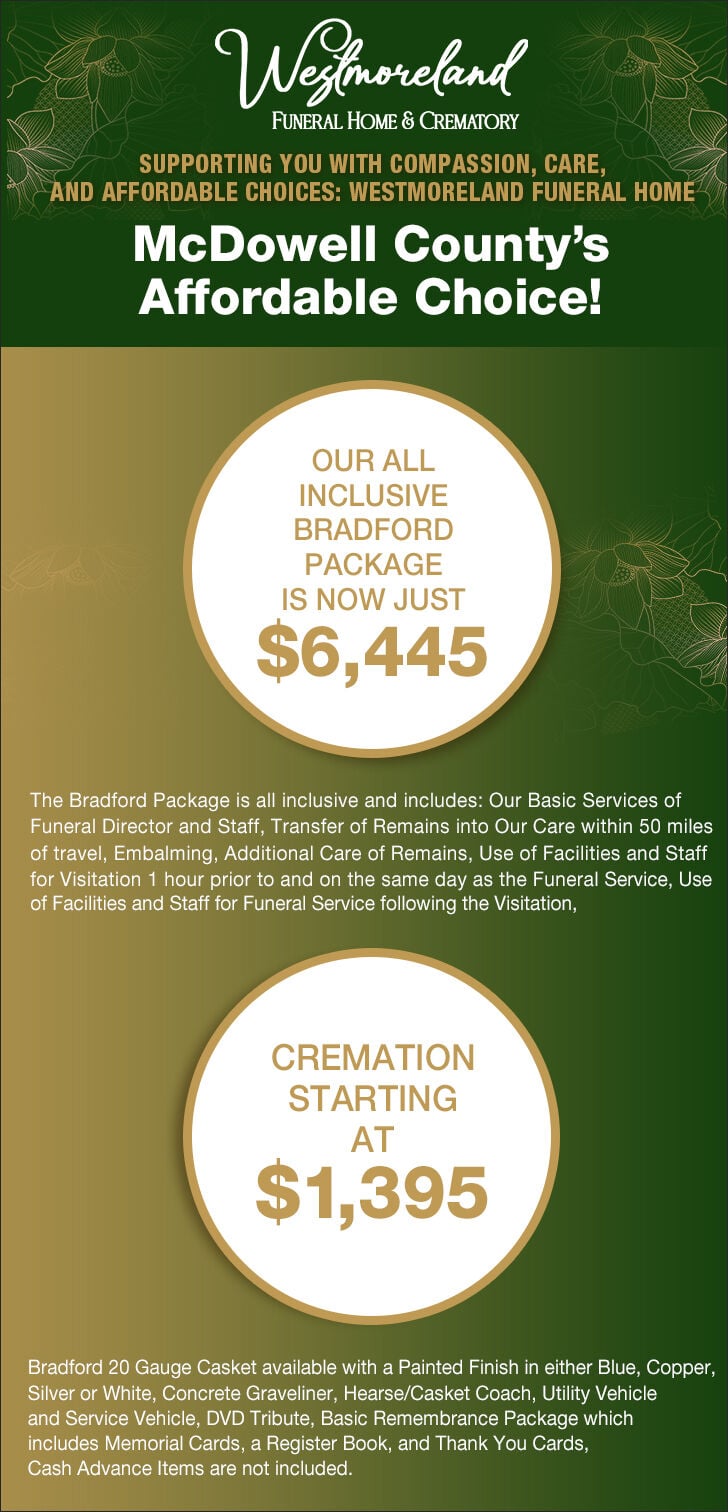 Westmoreland Funeral Home & Crematory Apr 10, 2026 Apr 10, 2026 Updated Apr 10, 2026 0 Facebook Twitter Bluesky WhatsApp SMS Email Print Copy article link Save ---------- A D V E R T I S E M E N T ---------- ---------- A D V E R T I S E M E N T ---------- Facebook Twitter Bluesky WhatsApp SMS Email Print Copy article link Save Most Popular 12-year-old arrested in death of classmate who was hit in the head by a metal water bottle McDowell County native started mowing lawns at 15. 5 years later, he has a business, employees McDowell County man charged with sexual assault of employee One person critically injured in Sunday crash involving bicycle in McDowell County This new spot in Marion is offering locally grown food and beer, run by farmers and a brewer Promotions Read the E-edition now – the digital replica of the newspaper! Download our mobile app for a customized experience! View All Print Ads Services S&S ROOFING Updated 21 hrs ago Education APPALACHIAN STATE UNIVERSITY Updated 21 hrs ago